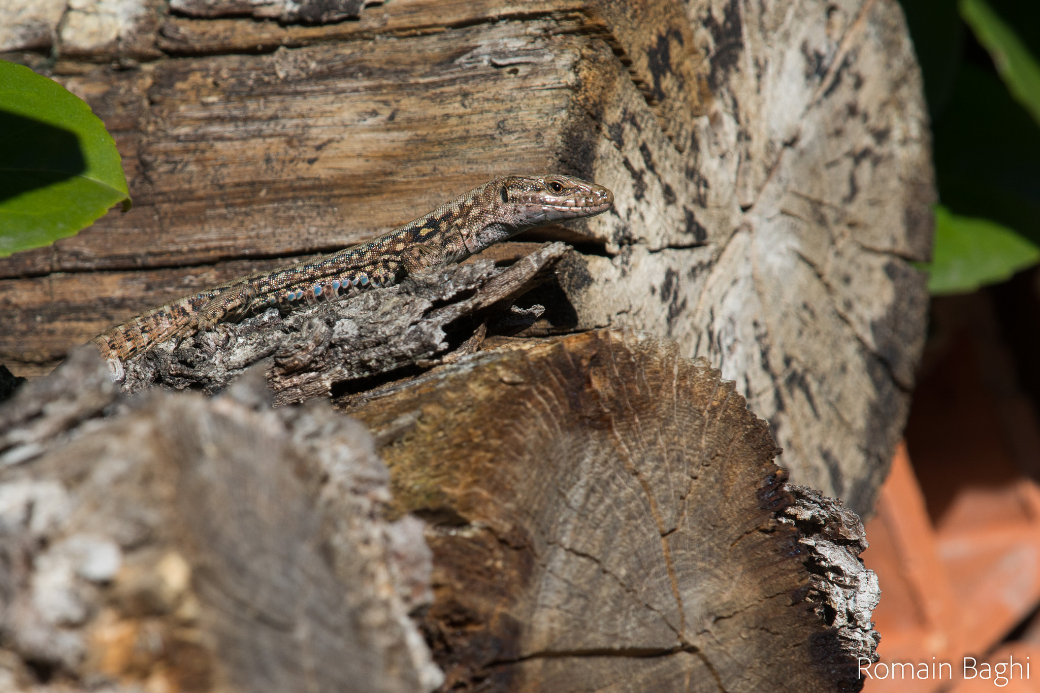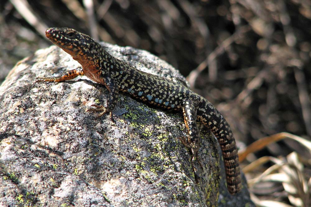 La robe, foncée sur les flancs et plus claire sur le dos, présente un assemblage de crème, de brun, de noir et de blanc (en proportions très variables selon les individus et les populations). On note deux lignes dorso-latérales claires qui se poursuivent souvent sur l'arrière du crâne (continues ou en pointillés) ainsi qu'un bandeau brun foncé ou noirâtre sur les flancs généralement maculé de taches claires (dont une, plus contrastée, se détache fortement au-dessus de l'insertion du bras sur fond noirâtre, formant une sorte d'ocelle isolé). Les femelles portent généralement une ligne ventro-latérale claire souvent assez floue et, chez elles, on observe régulièrement une ligne vertébrale foncée (continue ou discontinue : véritable ligne ou succession de tirets voire de points). La queue, lorsqu'elle n'est pas régénérée, porte un assemblage de taches à peu près identique sur chaque anneau (crème/noir/brun), ce qui lui confère au final une ornementation "séquencée" (répétition d'un même motif). On rencontre parfois des individus porteurs d'une teinte verte peu vive sur certaines zones du dos et des flancs (mâles, typiquement). Le dimorphisme sexuel est plutôt accusé : les mâles sont plus massifs que les femelles et leur crâne est plus volumineux. En outre, leur robe est fortement tachetée, avec des contrastes affirmés (sur les flancs et sur le dos), tandis que celle des femelles est en règle générale à tendance lignée, peu ou pas tachetée ("en règle générale", cf. galerie de photos). On note aussi une forte différence en ce qui concerne la coloration ventrale : elle est invariablement blanchâtre chez les femelles, alors qu'elle peut être rouge-orangé, jaune ou blanche chez les mâles. Ces derniers, par ailleurs, exhibent souvent des écailles ventrales externes bleu vif, voire -plus rarement- quelques petites taches bleues sur les flancs.