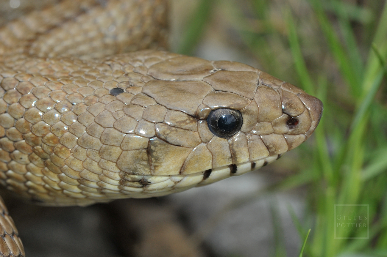 Cette couleuvre présente des écailles dorsales particulièrement lisses, plus ou moins luisantes selon l'incidence de la lumière. L'écaillure céphalique, assez singulière, est caractérisée par la présence d'une écaille rostrale remarquablement proéminente, fortement insérée entre les écailles internasales. Ce trait anatomique, facilement observable, permet quasiment à lui seul d'identifier l'espèce -dans le contexte hexagonal ou occitan- et de la distinguer aisément de deux autres couleuvres avec lesquelles elle est parfois confondue : sa congénère la Couleuvre d'Esculape (Zamenis longissimus) (qui revêt parfois une robe lignée) et, surtout, la Coronelle girondine (Coronella girondica) (individus à robe très contrastée, jeunes notamment, présentant vaguement un motif dorsal "en échelle").